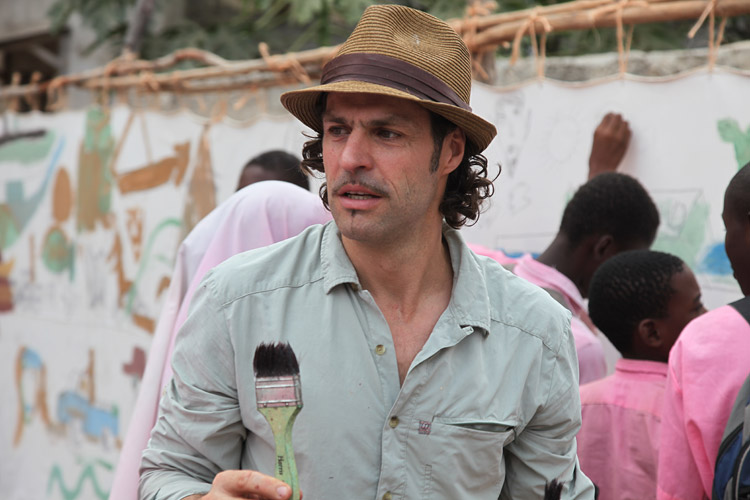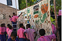 Sixty-odd kids gathered excitedly for the first session, yet they hesitated to make the first mark on the blank canvas. The artists quickly understood why: “These kids had never expressed themselves in such a way before,” Jesko says. “At first, they didn’t want to switch colours, or paint outside the bit of canvas where they had started to work.” Jesko and Lili helped them along by asking if they could ‘borrow’ a blue in exchange for a yellow. Jesko also shocked them by suddenly flinging paint at the canvas, and encouraging the kids to try it.
