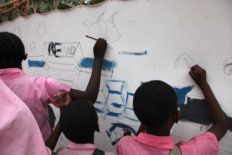 The students of Shela Primary School began their outdoor painting sessions with visiting artists Lili Nalovi and Jesko Willert hesitantly. “They were shy,” recalls Jesko, “I think they were scared of getting something wrong.” Nine weeks later, that reserve was gone. “They were much more open and poetic on the canvas,” says Lili. This progress was strikingly symbolized at the end of the project, when a bunch of the kids took off on Naomi dhow with a sail made from one of their huge canvasses. Over the Lamu channel they cruised, with their paintings flapping brightly above them: images of cars, helicopters, stars and hearts flying through the air, like dreams thrown to the wind.