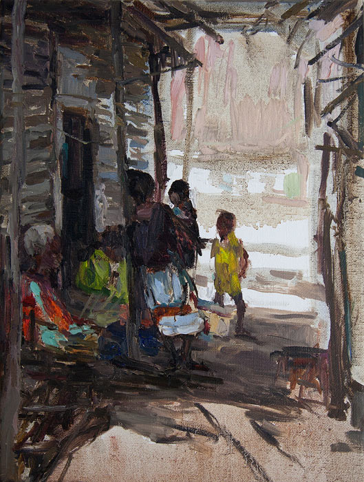 In Lamu, Margreet concentrated on the new kinds of light she witnessed. Her palette changed perceptibly to lighter colours, emphasizing the sun’s brightness on the landscape in contrast to the deeper shadows of interiors. But light was not her only challenge. “Lamu is vibrant” she comments. Translating the vibrancy she experienced and sense of connectedness of people became central to her painting goals at the festival.