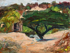 Diederik speaks with fondness about his visit to Matondoni village, one of several destinations the festival artists visited to set up easels to paint landscapes. “When we arrived in Matondoni,” he explains, “we were greeted by a group of villagers singing and dancing—welcoming us”. It is their friendliness and gentleness that attracts him to the place. In the village, Diederik chose an intimate ‘spot’ to set up his easel. He sat squarely in the doorway of a home. The family provided a traditional usitu-style stool and other accoutrement for the artist to use for his work. They sat nearby, some working at their chores and others curiously watching Diederik paint. The small children observed quietly until the stillness bored them and they moved away to play with their friends. Life moved on with its own rhythms and the artist was an honorary member of the family, painting at his easel.