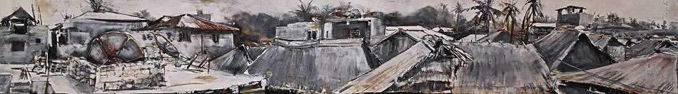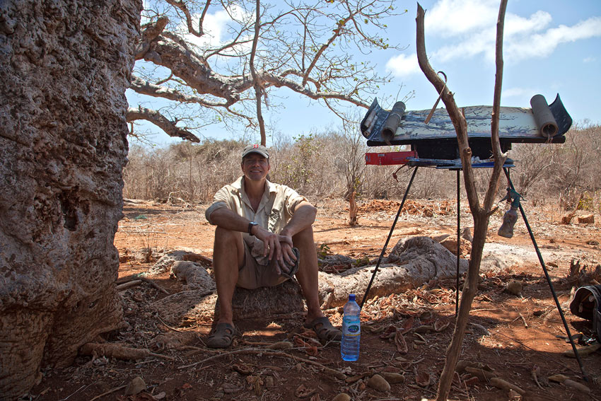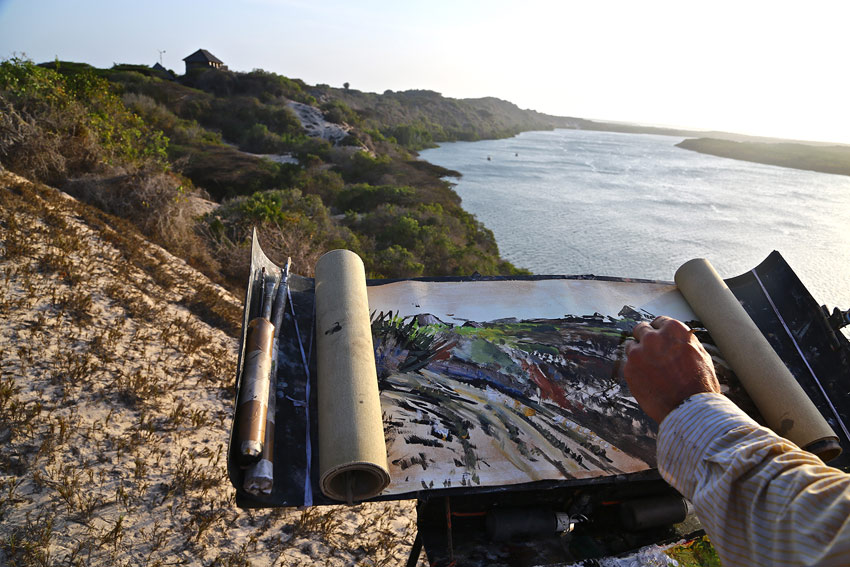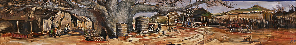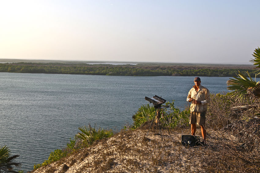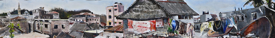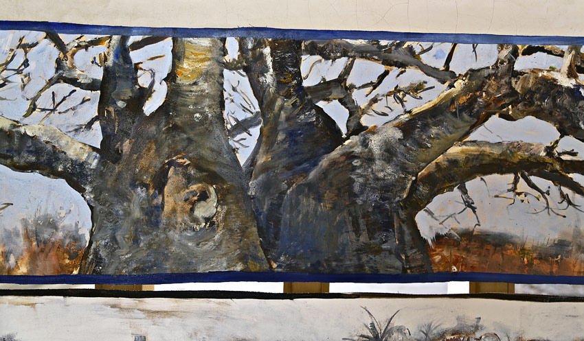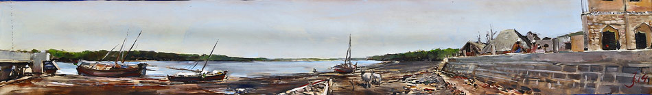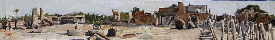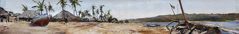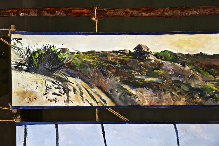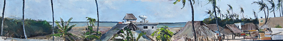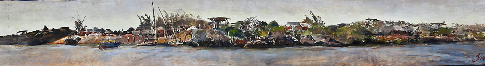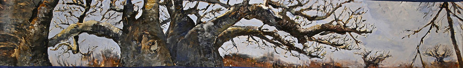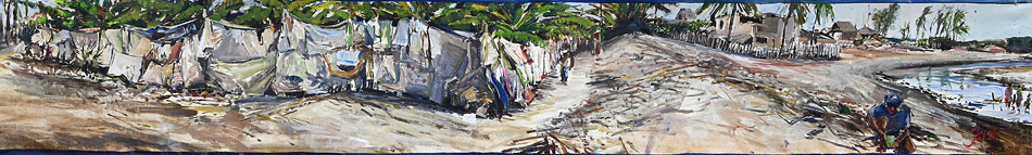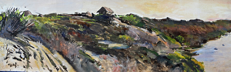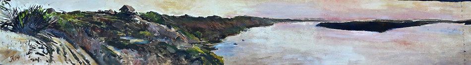 Jacob Kerssemakers, born in 1968, prefers to work ‚en plein air’, painting and drawing the vastness of the landscape as panoramas in long formats of more than two until five meters length. He captures the width of the horizon until 360° in a roll of canvas using a self-developed roller board. While painting mirages are changing colours. Finally the contemplator will find different aspects at different times in the same landscape.