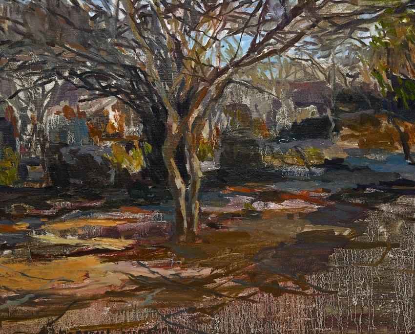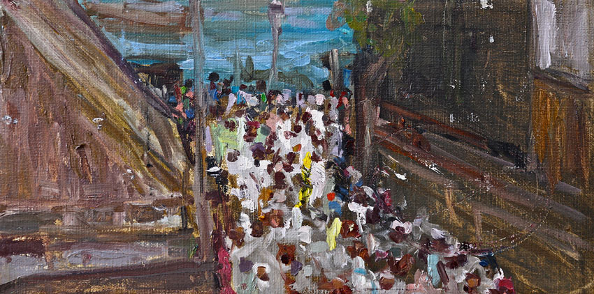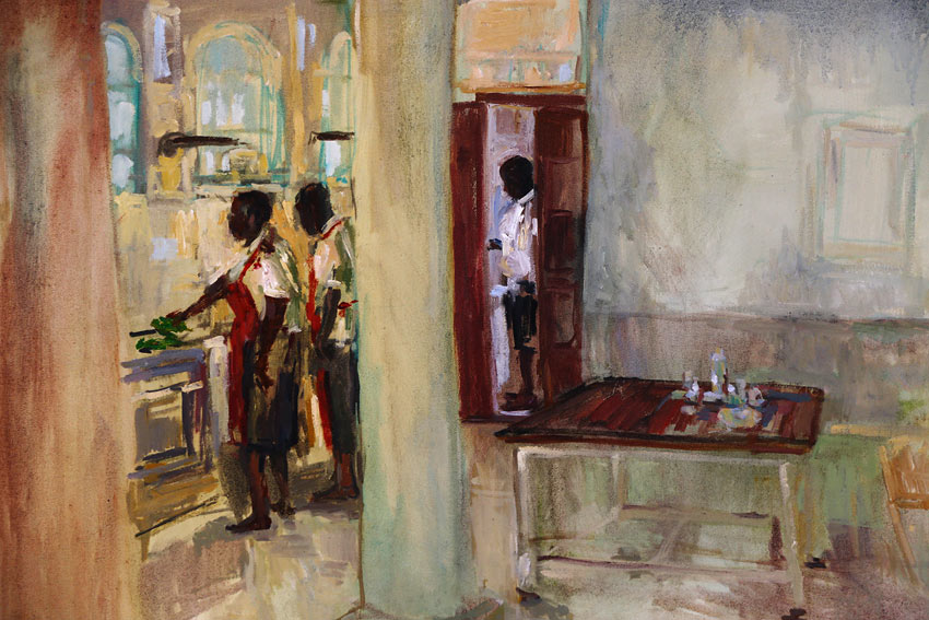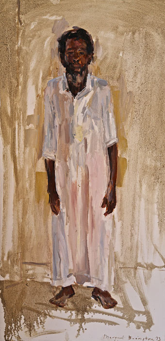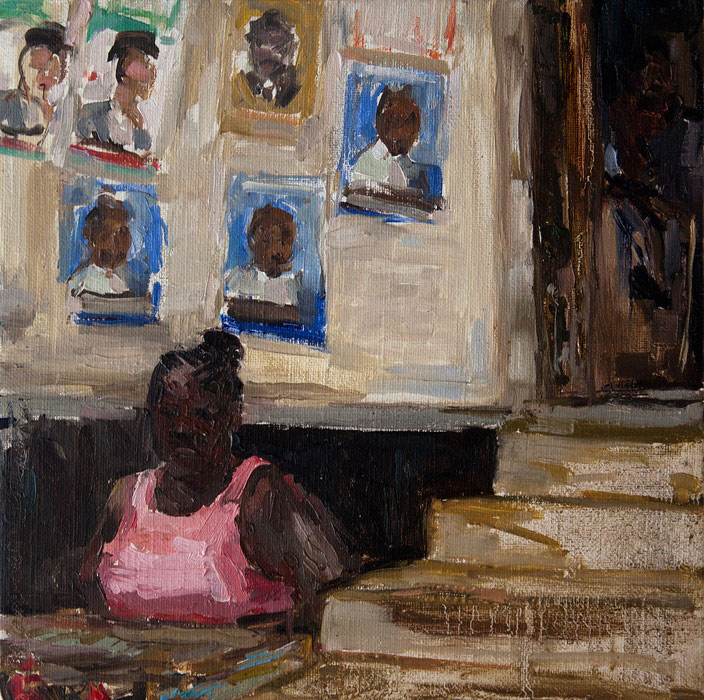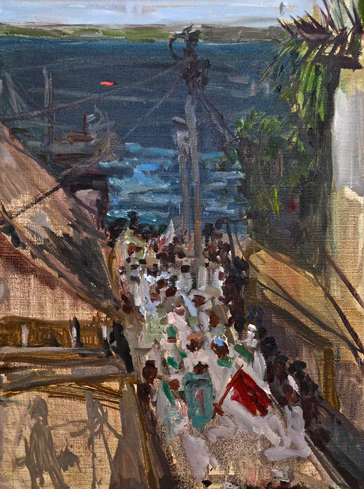 In Lamu, Margreet concentrated on the new kinds of light she witnessed. Her palette changed perceptibly to lighter colours, emphasizing the sun’s brightness on the landscape in contrast to the deeper shadows of interiors. But light was not her only challenge. “Lamu is vibrant” she comments. Translating the vibrancy she experienced and sense of connectedness of people became central to her painting goals at the festival.
