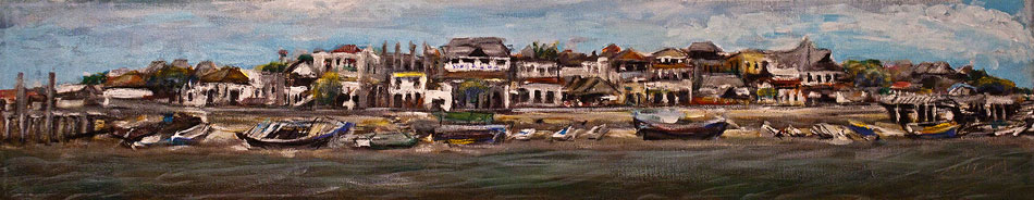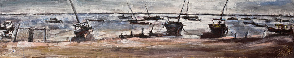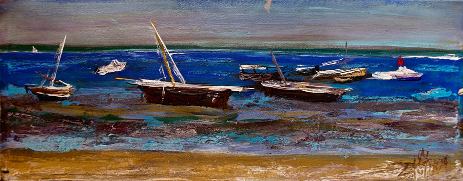 Samuel Githui is known for painting realistic versions of familiar city scapes of Nairobi, his hometown. His city scenes make people smile at the wit, intelligence and capacity of the human spirit and to grimace at the faltering social and political system that necessitates living so precariously. But in Lamu, Githui is always in awe at the tranquillity he experiences, as if the sea washes over him erasing the noise, the hustle and the rough edges of Nairobi from his skin. “The rich culture and the environment in Lamu,” he gently reflects, “is like no other place. It is as life should be.” Githui has visited Lamu numerous times, for art festivals and workshops as well as visiting on his own initiative. That speaks volumes.