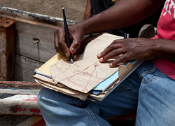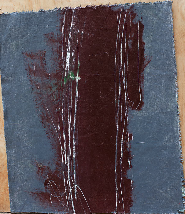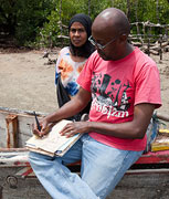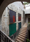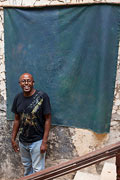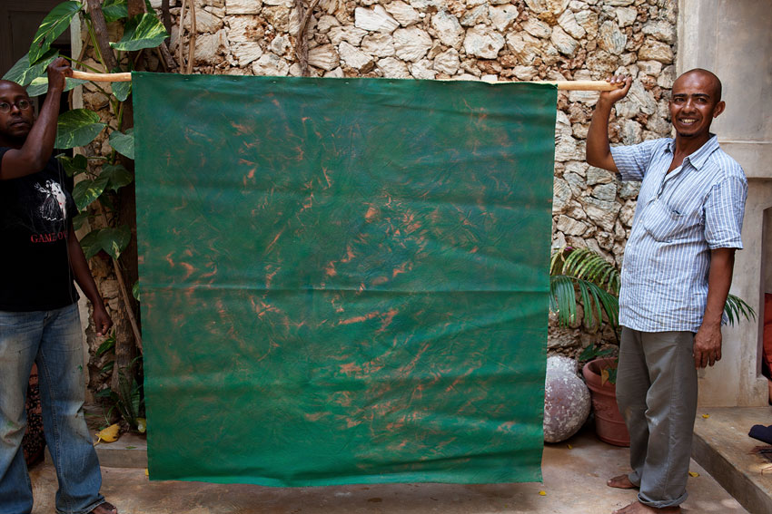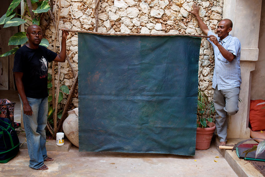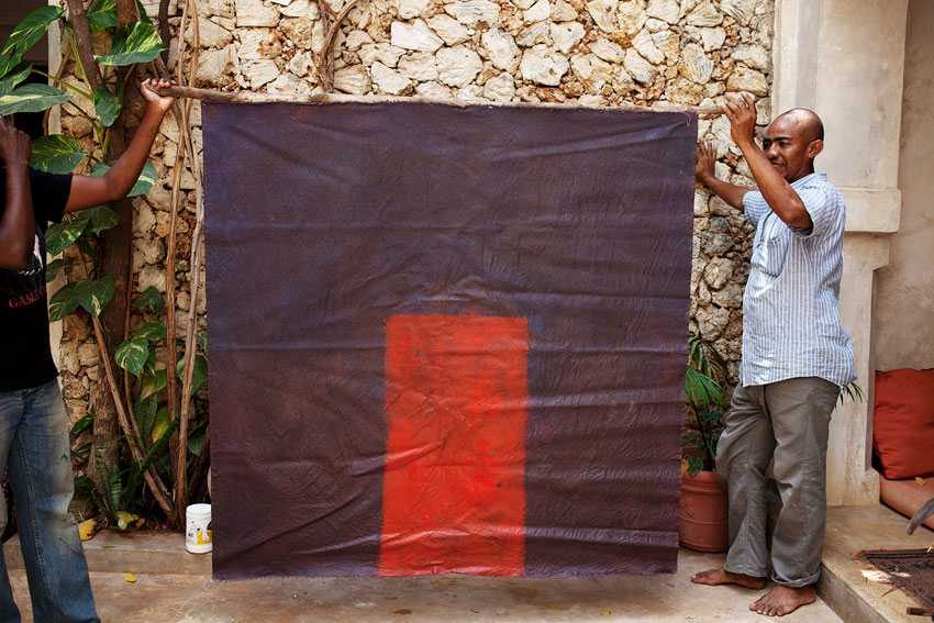 “I envy the kids growing up in Lamu” Justus Kyalo remarks, as he watches children playing freely in carless streets and riding donkeys for pleasure. The pace of Lamu life works well for him and its landscapes are in inspiration. “I love the ocean, beaches and plants that I see,” he exclaims, all the natural elements that make Lamu a special place. Kyalo’s method of working is to experience the space he is in by sitting and listening to people around him, whether it is the market, the town square, shops, seated in someone’s orchard of mangoes or at the seaside. From these moments he collects the nuances of moods, the buzz, so to speak. Then, back at his work space he begins to translate the sights, sounds and smells with paint on unstretched canvas. Wearing headphones to hear his music, he begins the process. He dyes the canvas in colour and applies further layers with a brush. The effect is colours absorbed, resonating with moods, fragments of memories or suggestive natural elements. Sometimes he scratches the surface, like an etching of calligraphy, which resonates with Arabic writing so prevalent on houses and doorways.