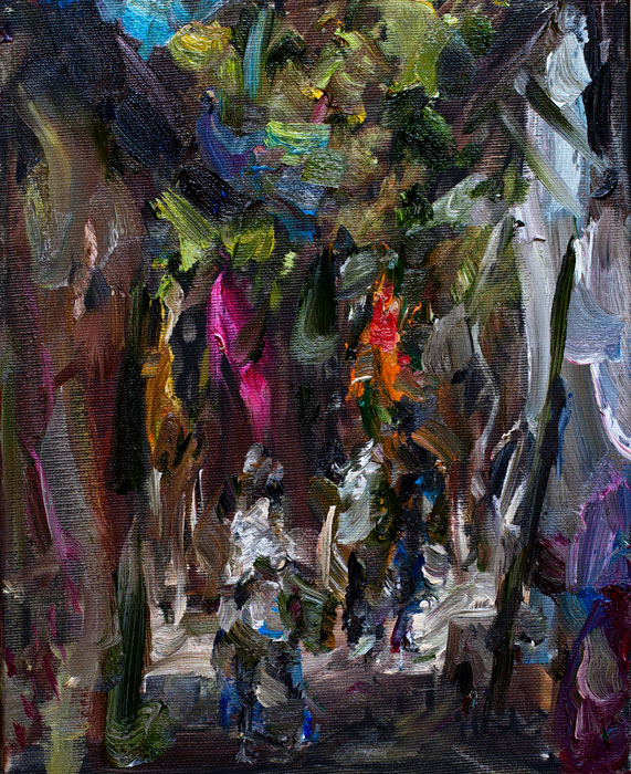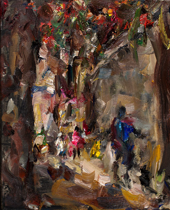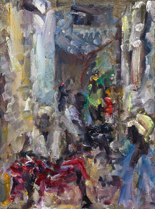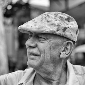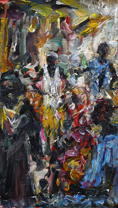 Standing in Lamu’s market place, Jürgen studies his almost completed painting with an unlit cigarette dangling from his lips. He turns to the people gathered watching him and wipes his thick paint brush with a cloth, wiping off paint. He smiles at the group of people and makes a joke with them then turns towards his painting and roughly applies new paint to his brush. He holds his arm ready like a javelin thrower and in a quick jab the brush makes contact with the canvas at the spot he has already identified. The jab is accentuated with a quick twist of the wrist as he adds emphasis or highlights to his painting. It is a typical Jürgen move, like creating punctuation marks to his canvas. I watched this move more than once and each time it filled me with fascination of his painting technique.