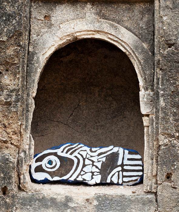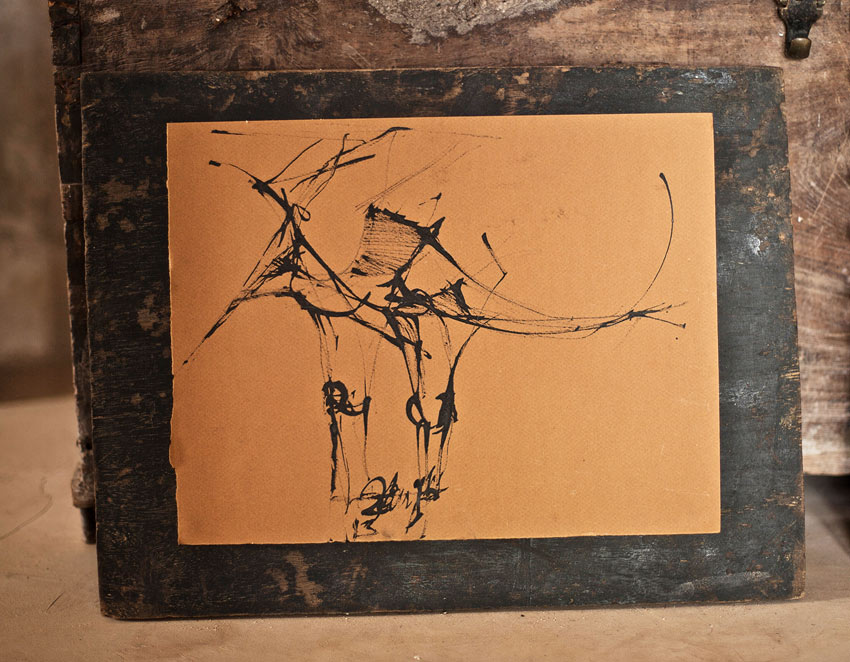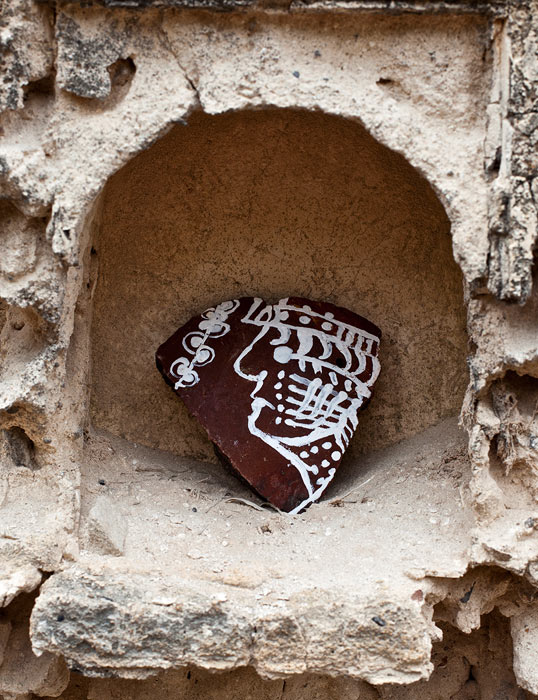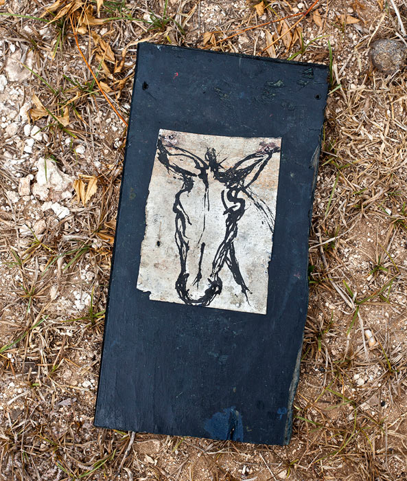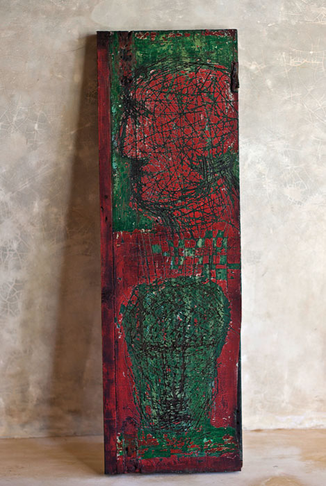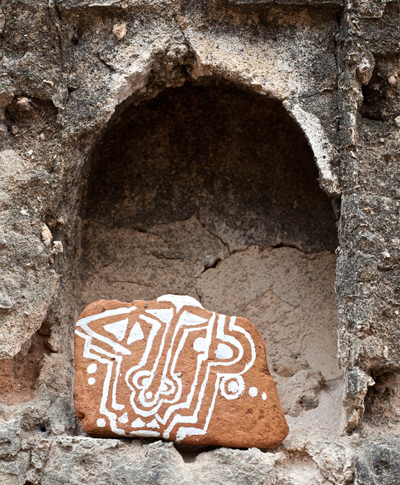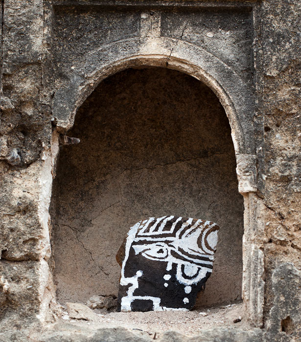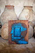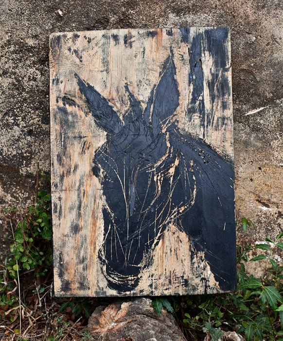 El Tayeb doesn’t hear their questions. Instead he concentrates on drawing his subject—a dog taking a nap in the shade nearby. The gathering begins to figure it out and they call out to each other “anachora mbwa”, he is drawing the dog. Now, they are truly confused. Why the dog? Earlier, he was drawing donkeys and collecting pottery shards—just as confusing. “It’s not only painting that I am interested in, El Tayeb explains holding out the pottery pieces he’s collected, “it’s also about Lamu’s history and culture.” Later, the shards reappear. On them, he has drawn ancient-looking faces resembling those of Mayan, Egyptian and Incan art. They are what El Tayeb refers to as his “archaeology of life”. Other works are painted on discarded wood—pieces from window shutters, doors and the like. Here he applies paint and etches figures in the pigment. The process ages the piece, invoking the past and excavating the present—in an El Tayeb way.