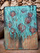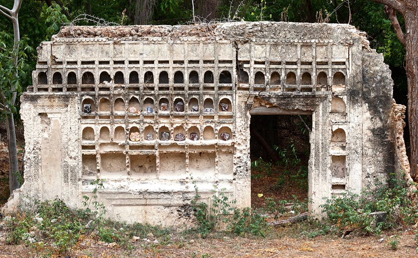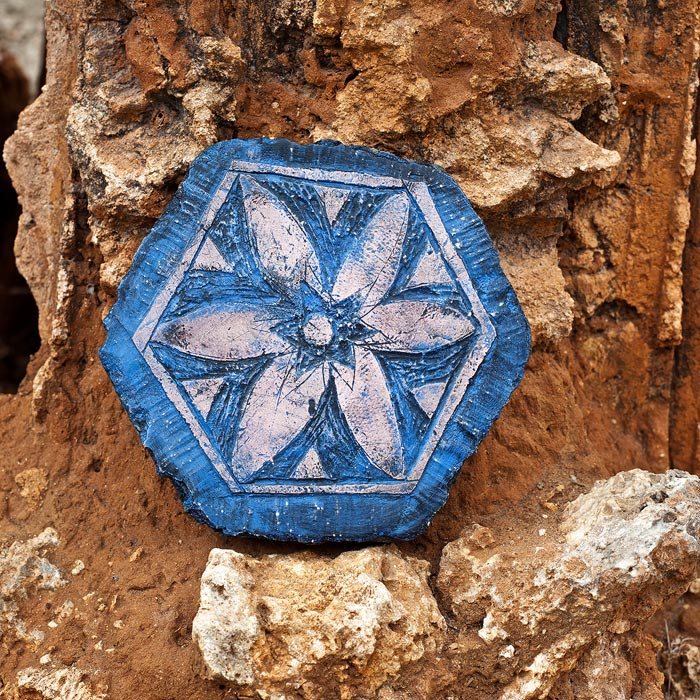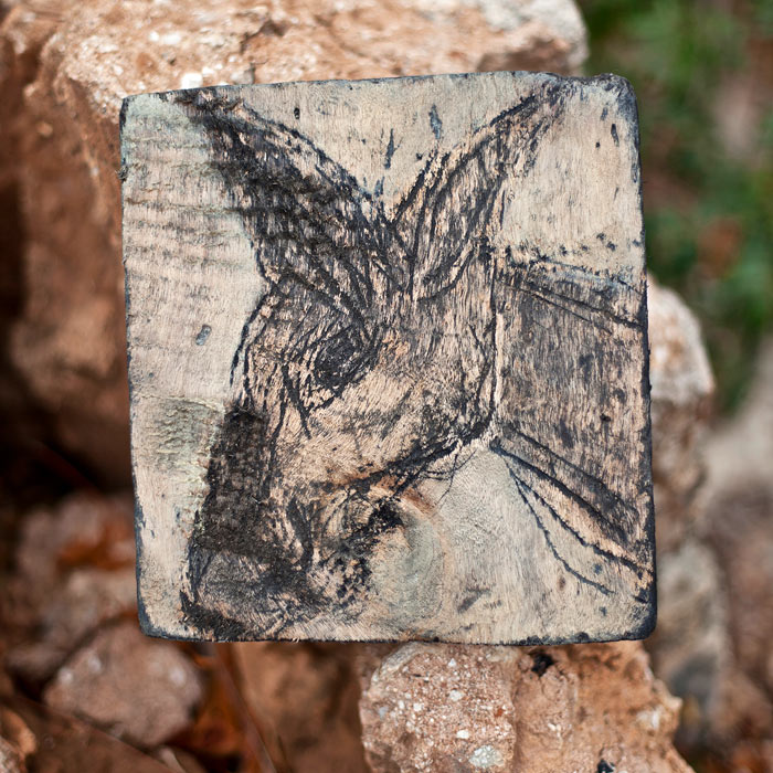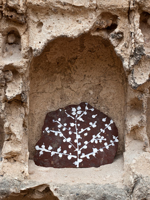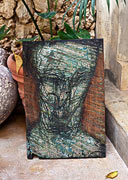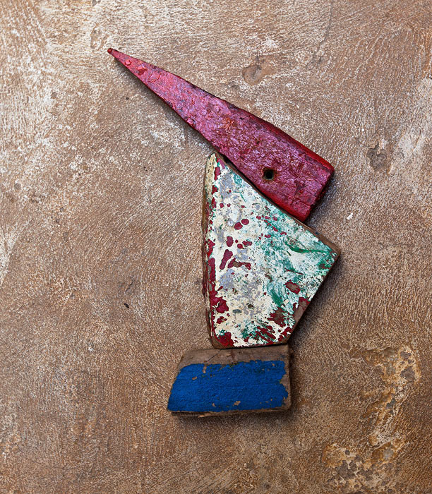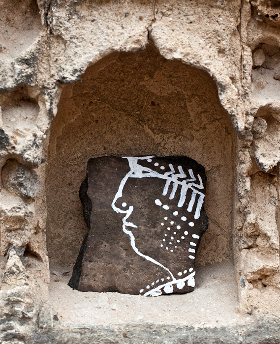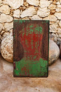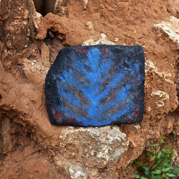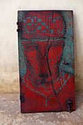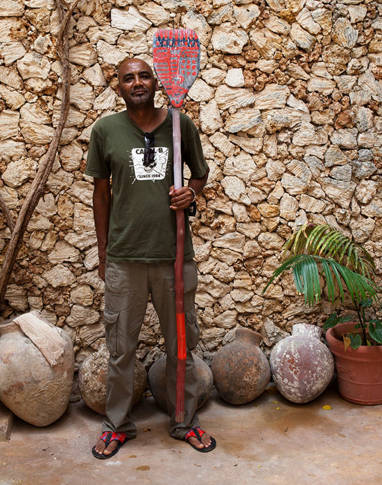 El Tayeb doesn’t hear their questions. Instead he concentrates on drawing his subject—a dog taking a nap in the shade nearby. The gathering begins to figure it out and they call out to each other “anachora mbwa”, he is drawing the dog. Now, they are truly confused. Why the dog? Earlier, he was drawing donkeys and collecting pottery shards—just as confusing. “It’s not only painting that I am interested in, El Tayeb explains holding out the pottery pieces he’s collected, “it’s also about Lamu’s history and culture.” Later, the shards reappear. On them, he has drawn ancient-looking faces resembling those of Mayan, Egyptian and Incan art. They are what El Tayeb refers to as his “archaeology of life”. Other works are painted on discarded wood—pieces from window shutters, doors and the like. Here he applies paint and etches figures in the pigment. The process ages the piece, invoking the past and excavating the present—in an El Tayeb way.