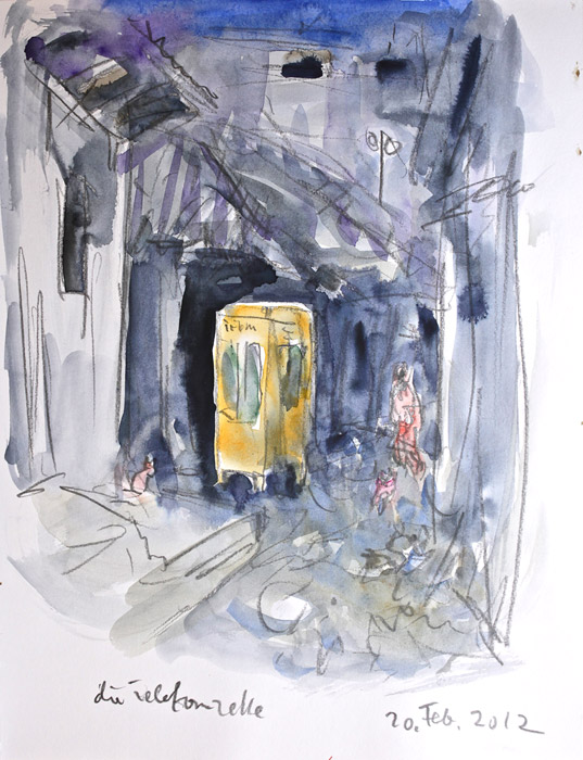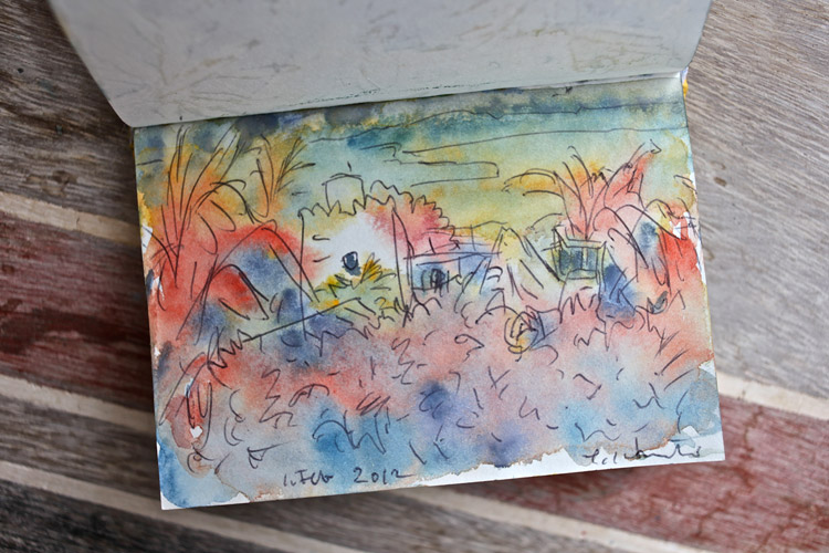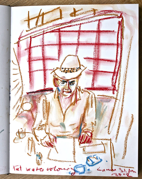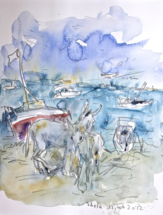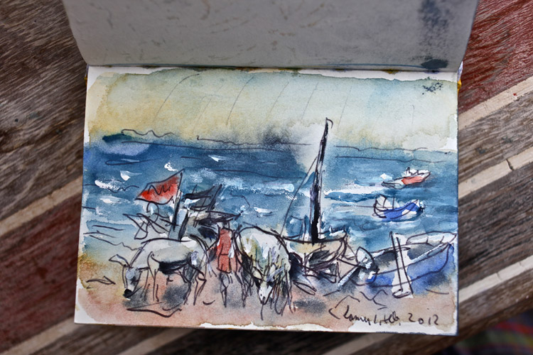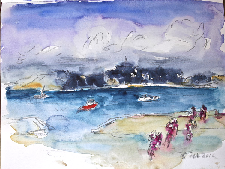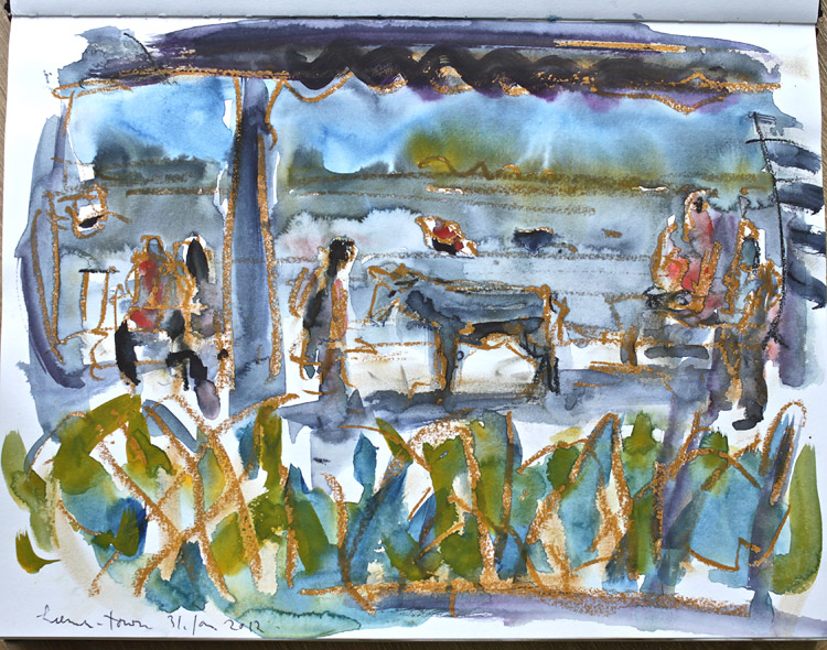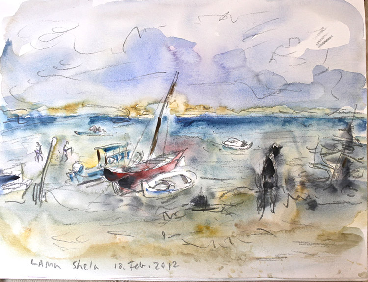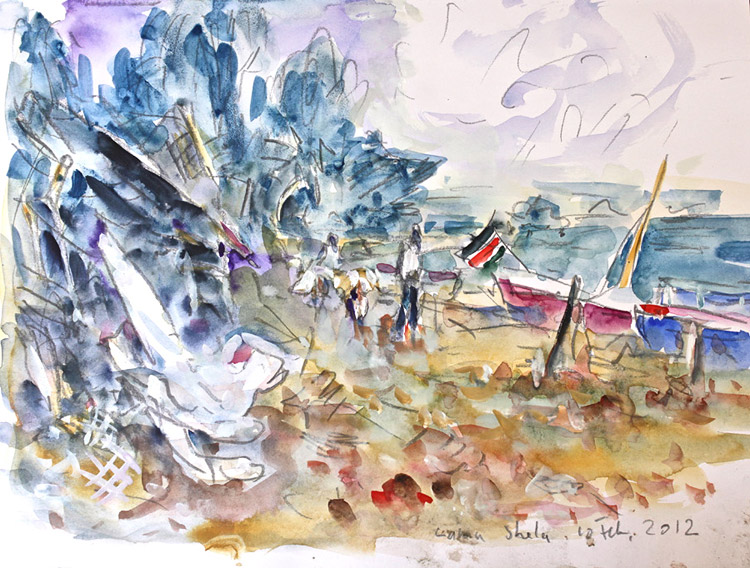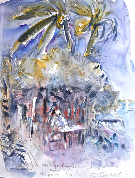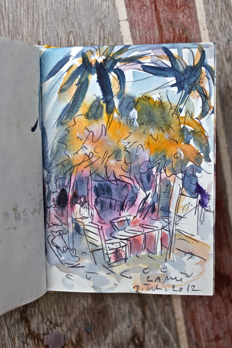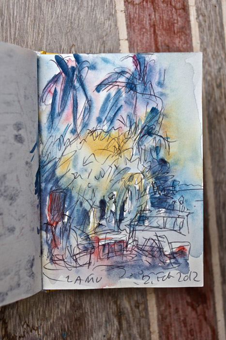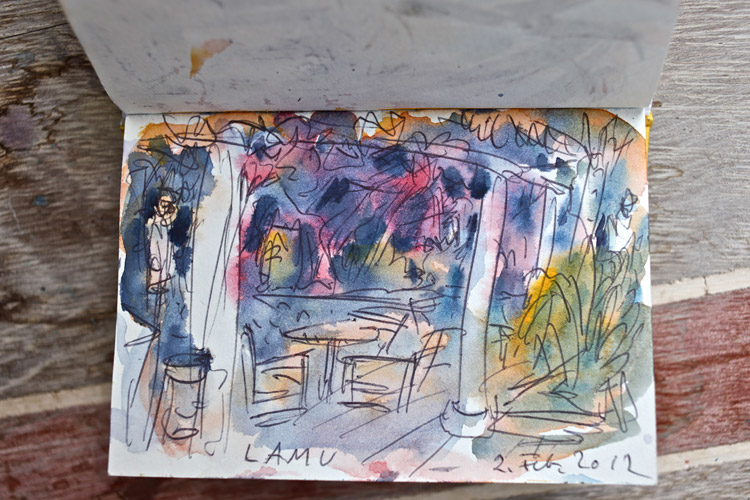 Peter began doing aquarelle studies in his sketchbook partly as an exercise to relax his painting style. He’d first worked like this in New York in 1981, doing postcard size aquarelle sketches to catch the multiple impressions thrown up by the city. Over the years he developed this technique, which he clarifies is not “about painting exactly what’s there, but what I like.” In Lamu, Peter sketched outside with a ballpoint pen and applied paint to the page later when he was indoors. This was the best part for him, wetting the page and then adding the colour: “The interplay of chance and intuition in this method really appeals to me.” He uses traditional aquarelle paint which is less brilliant, so that the work has more of a washed out quality. His aim is to achieve an amorphous image, smoothing out the distinction between any figure and its surrounding, so no single shape stands out.