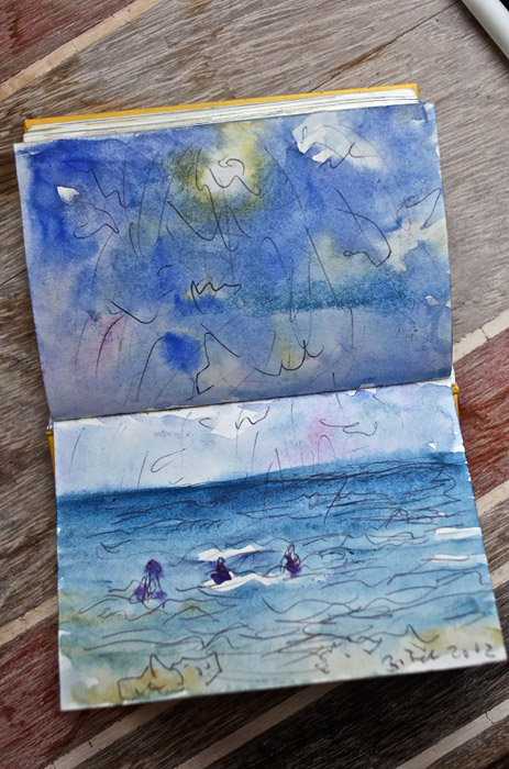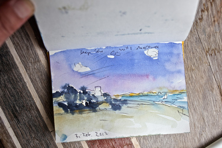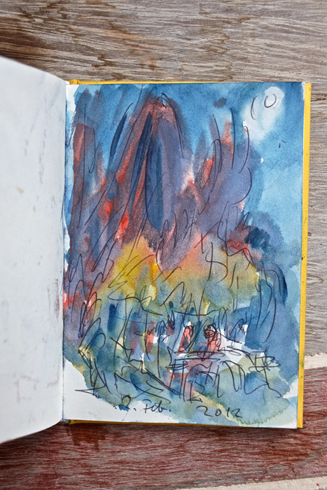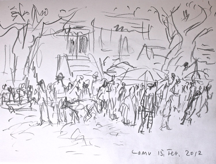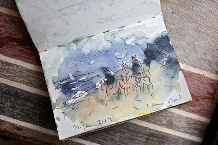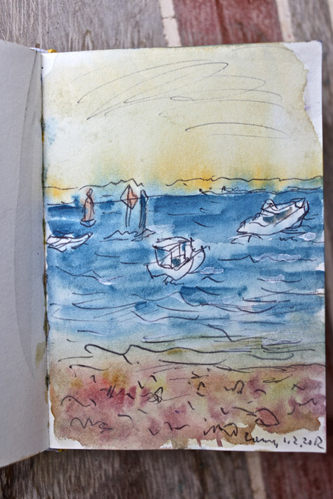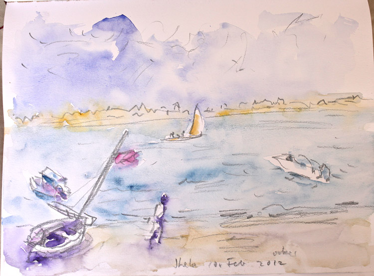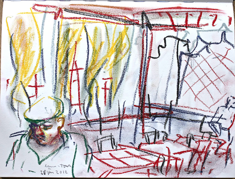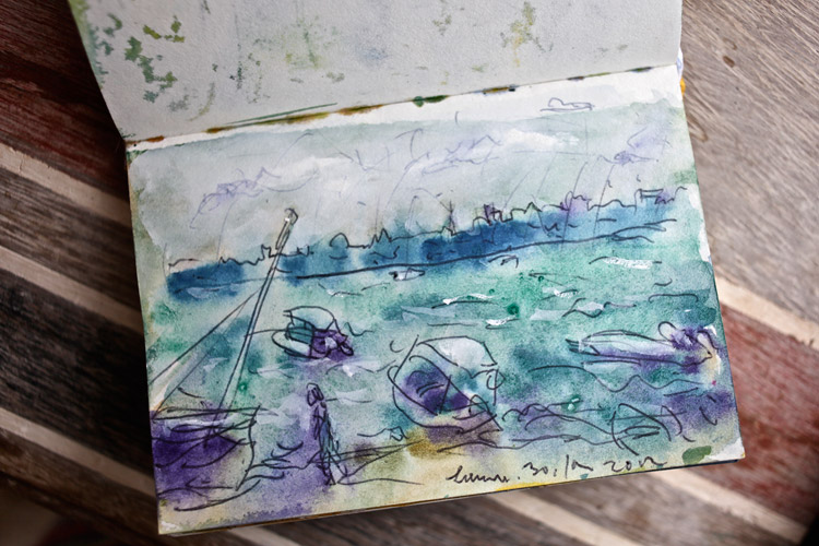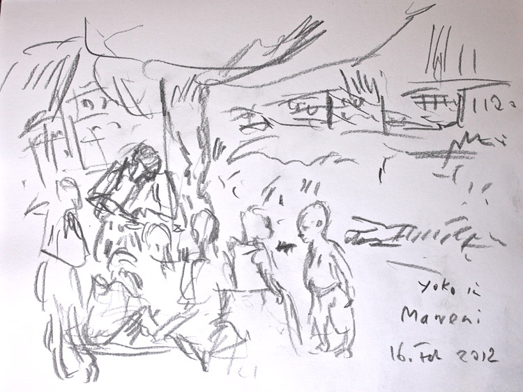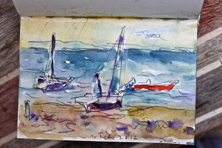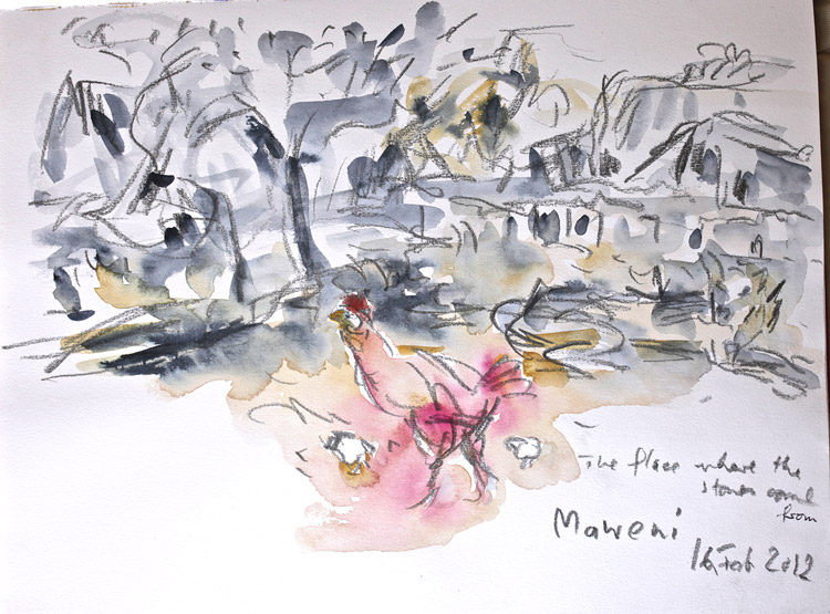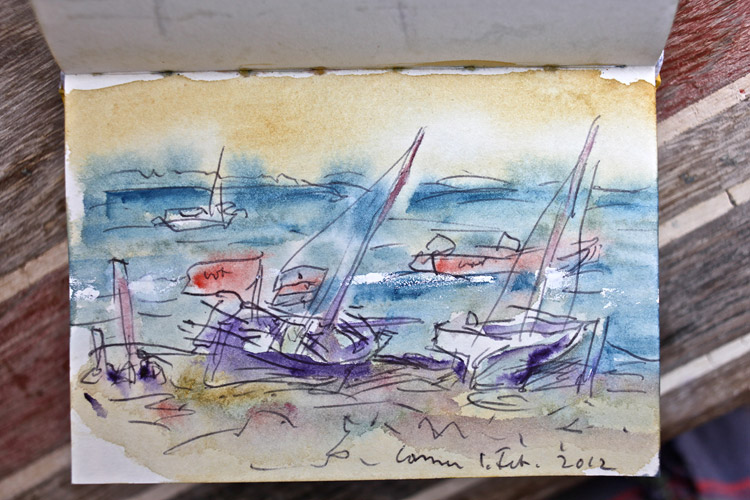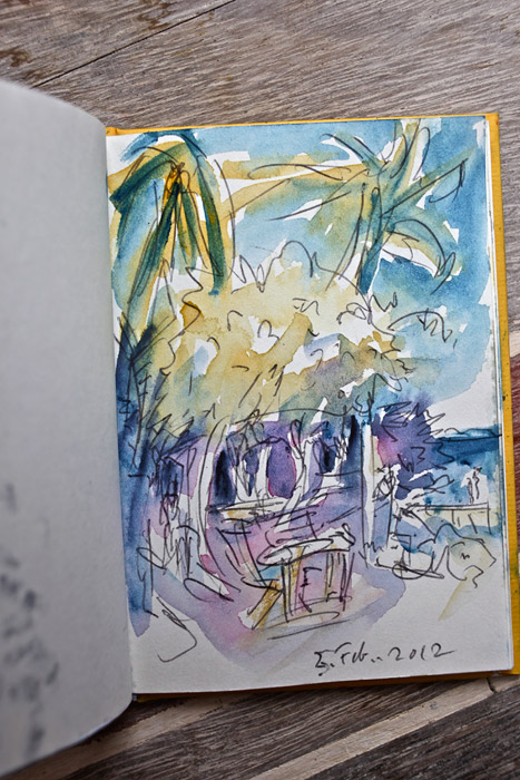 Peter began doing aquarelle studies in his sketchbook partly as an exercise to relax his painting style. He’d first worked like this in New York in 1981, doing postcard size aquarelle sketches to catch the multiple impressions thrown up by the city. Over the years he developed this technique, which he clarifies is not “about painting exactly what’s there, but what I like.” In Lamu, Peter sketched outside with a ballpoint pen and applied paint to the page later when he was indoors. This was the best part for him, wetting the page and then adding the colour: “The interplay of chance and intuition in this method really appeals to me.” He uses traditional aquarelle paint which is less brilliant, so that the work has more of a washed out quality. His aim is to achieve an amorphous image, smoothing out the distinction between any figure and its surrounding, so no single shape stands out.