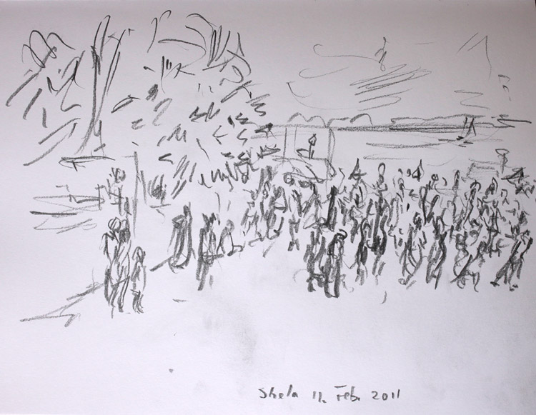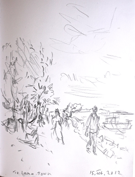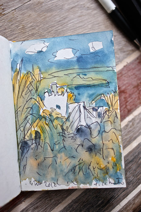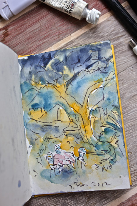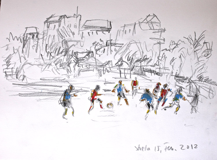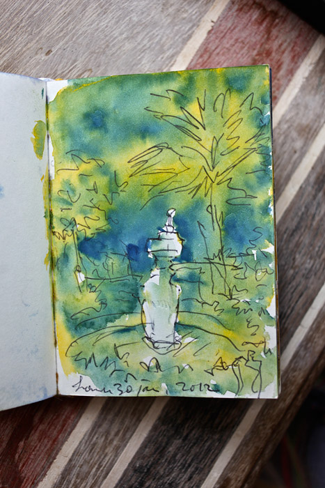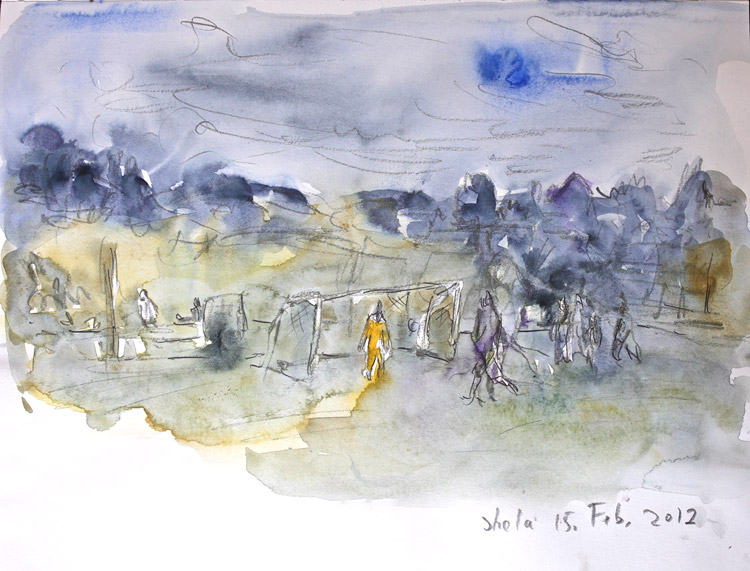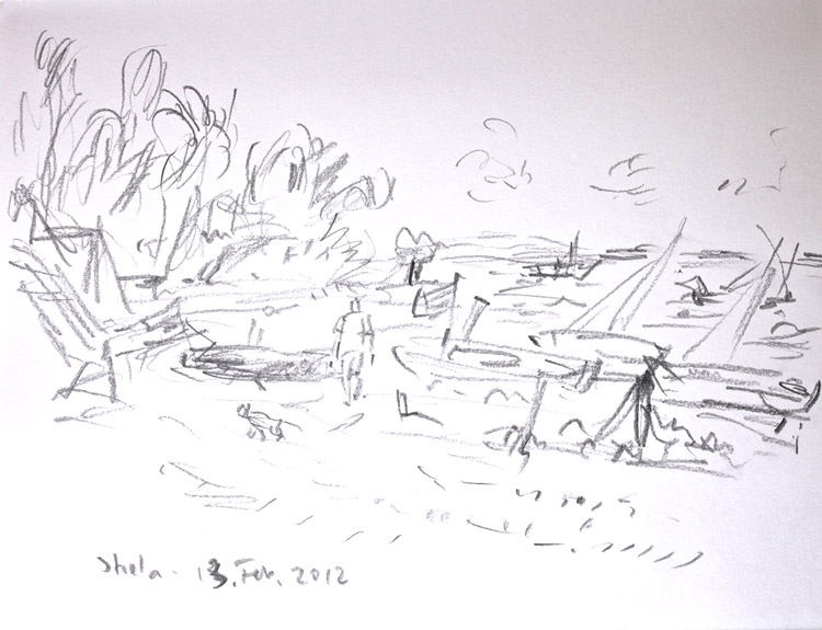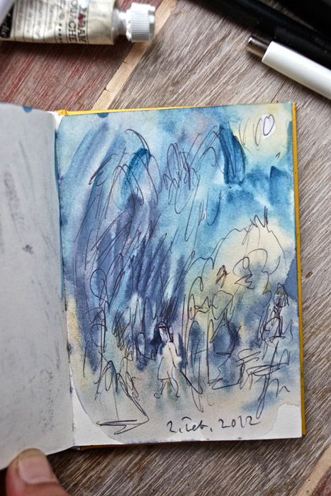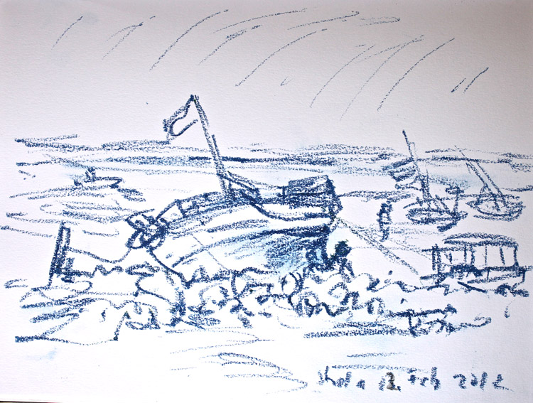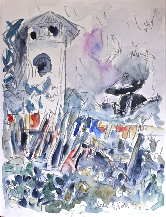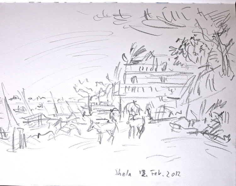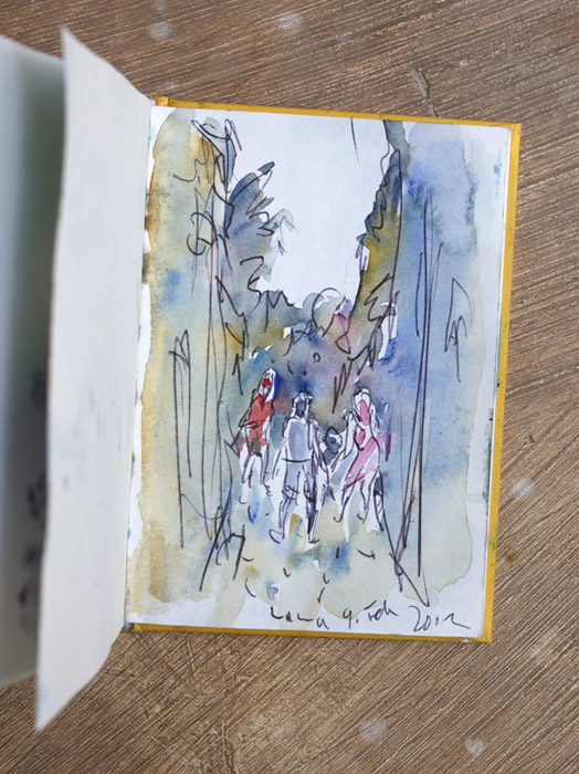 Peter began doing aquarelle studies in his sketchbook partly as an exercise to relax his painting style. He’d first worked like this in New York in 1981, doing postcard size aquarelle sketches to catch the multiple impressions thrown up by the city. Over the years he developed this technique, which he clarifies is not “about painting exactly what’s there, but what I like.” In Lamu, Peter sketched outside with a ballpoint pen and applied paint to the page later when he was indoors. This was the best part for him, wetting the page and then adding the colour: “The interplay of chance and intuition in this method really appeals to me.” He uses traditional aquarelle paint which is less brilliant, so that the work has more of a washed out quality. His aim is to achieve an amorphous image, smoothing out the distinction between any figure and its surrounding, so no single shape stands out.