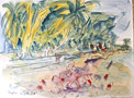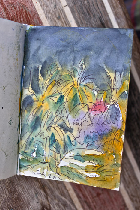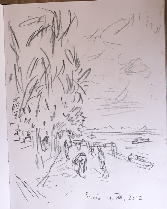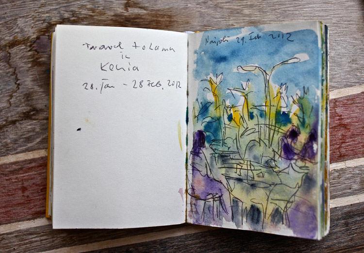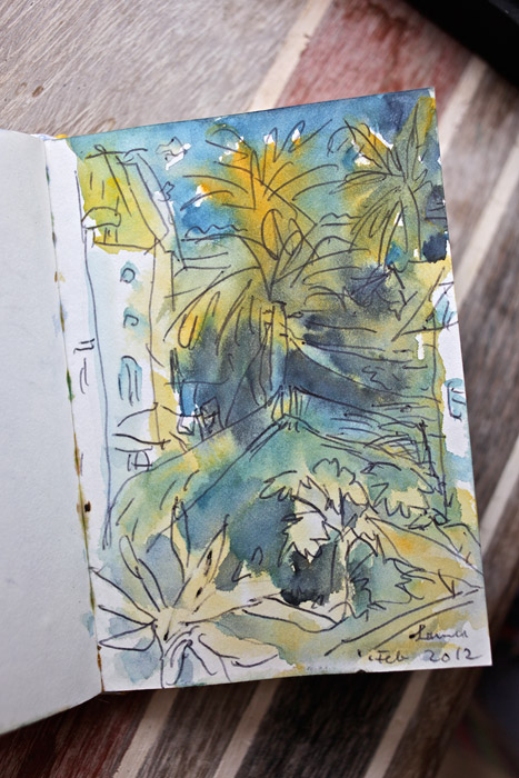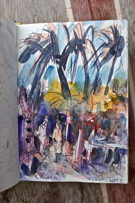 Yellow palm trees, bright as stars, amidst a haze of green foliage. Purple palm trees dancing in the breeze, stems flying like arms at a rave. Blue palms leaning towards the ocean as if to whisper their devotion. Palm leaves pinked by the setting sun. Palm trees like windmills, like lampposts, like women with hair blown wild by the wind…. In Peter Schunter’s Lamu sketchbooks this tropical tree is a recurring motif, beautifully symbolizing the meshing of memory and technique that characterizes the sketches.